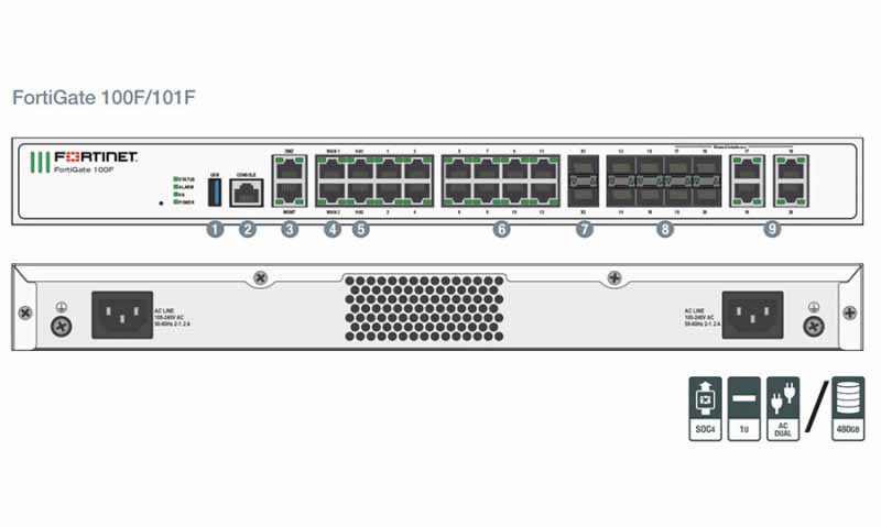 | FortiGate 101F | FG-101F | 22x GE RJ45 ports (including 2x WAN ports, 1x DMZ port, 1x Mgmt port, 2x HA ports, 16x switch ports with 4 SFP port shared media), 4 SFP ports, 2x 10 GE SFP+ FortiLinks, 480GB onboard storage, dual power supplies redundancy. |